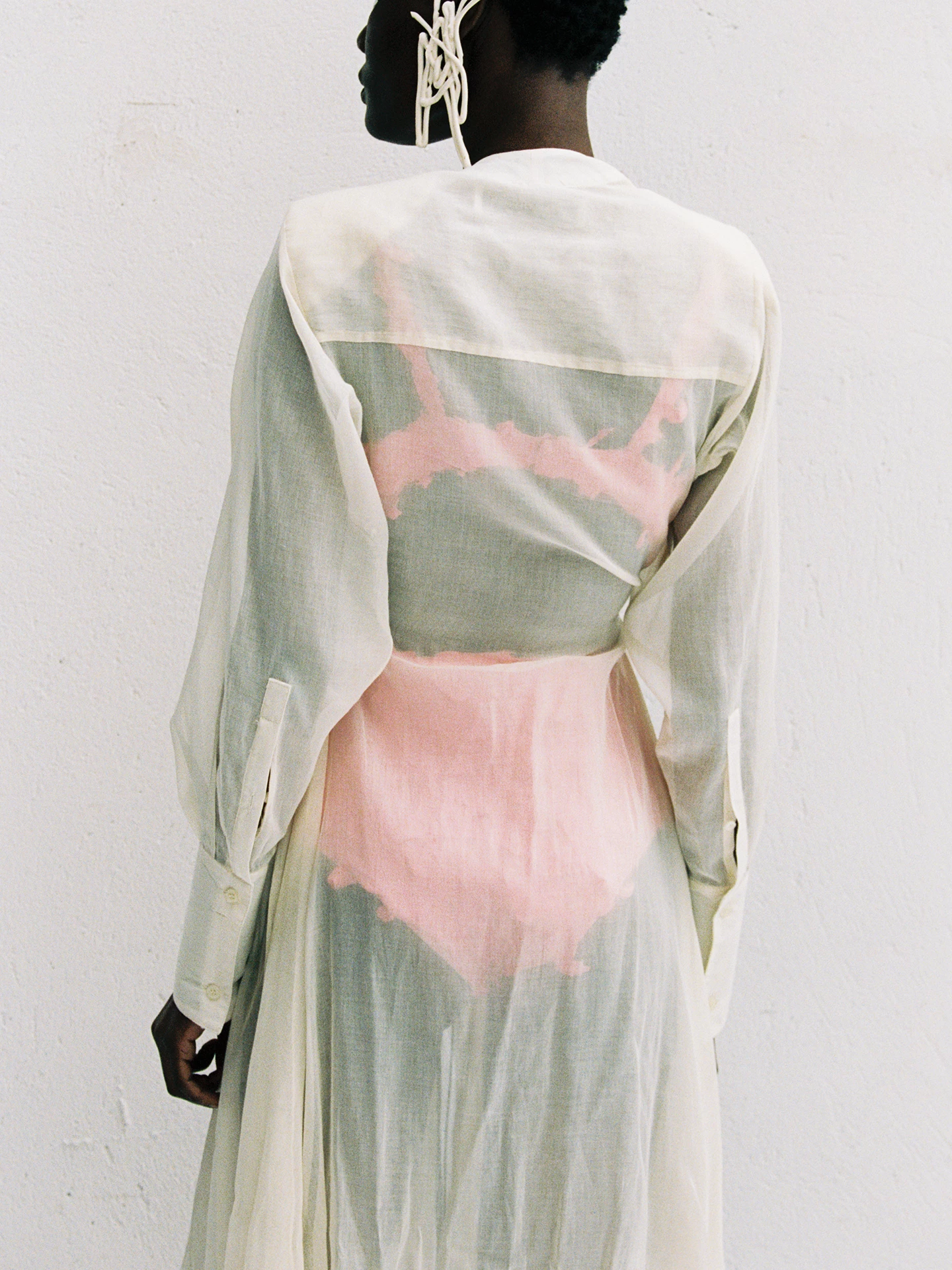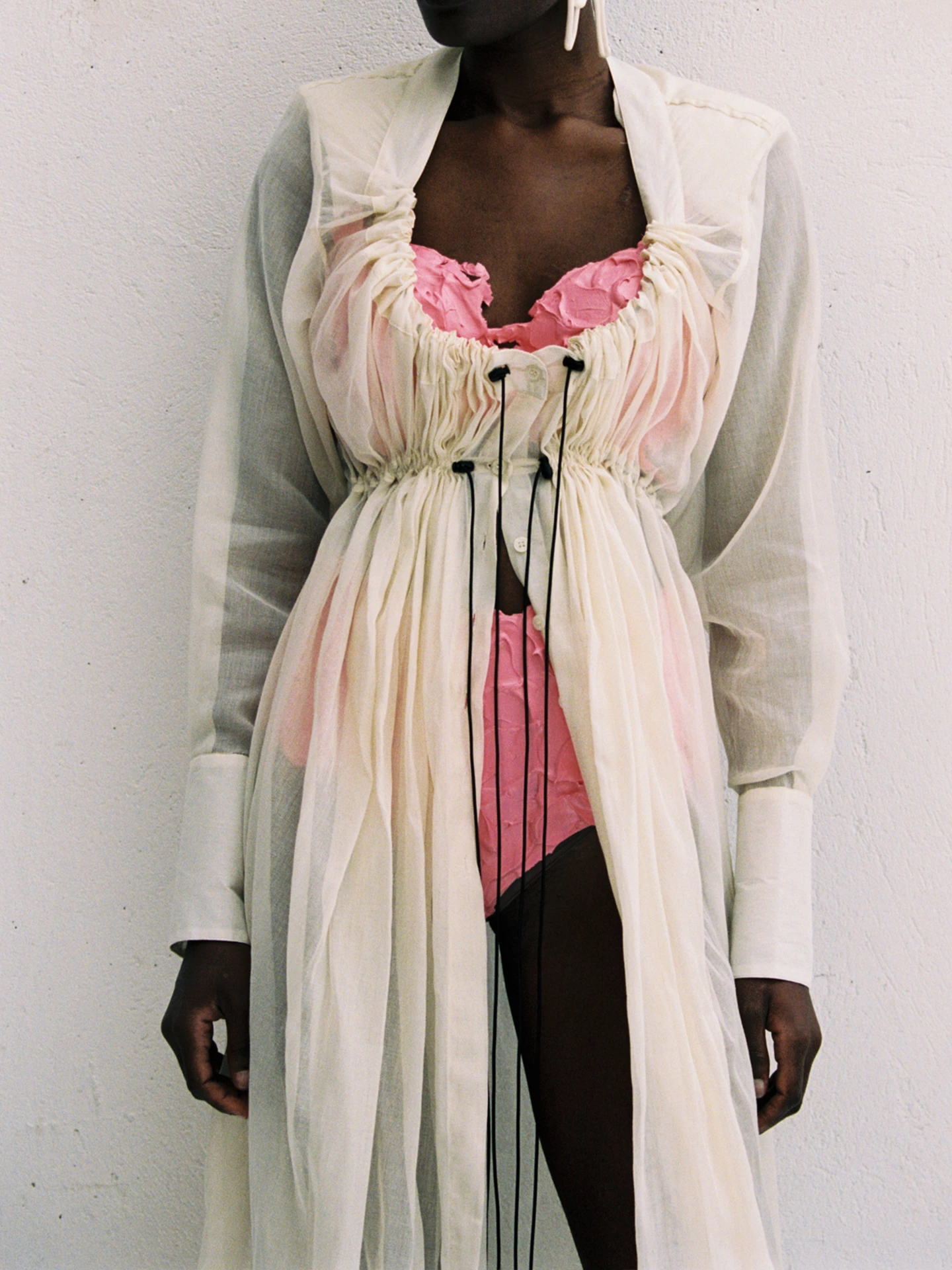 The dress has a floor-length fit and features one adjustable drawstrings and shoulder pads for a structured silhouette.