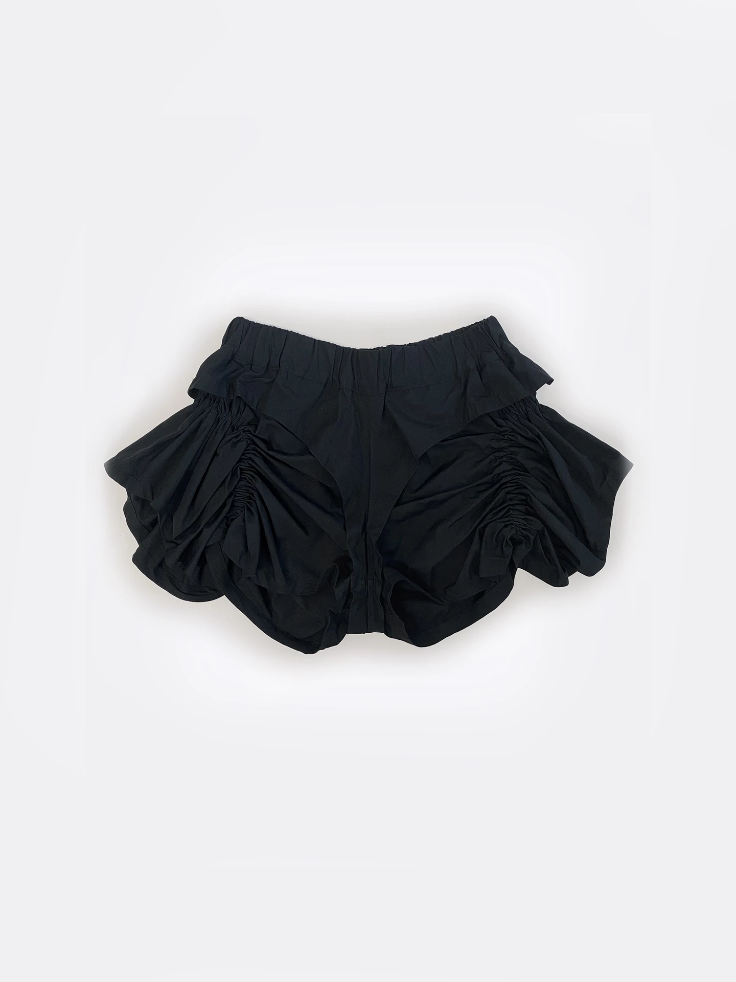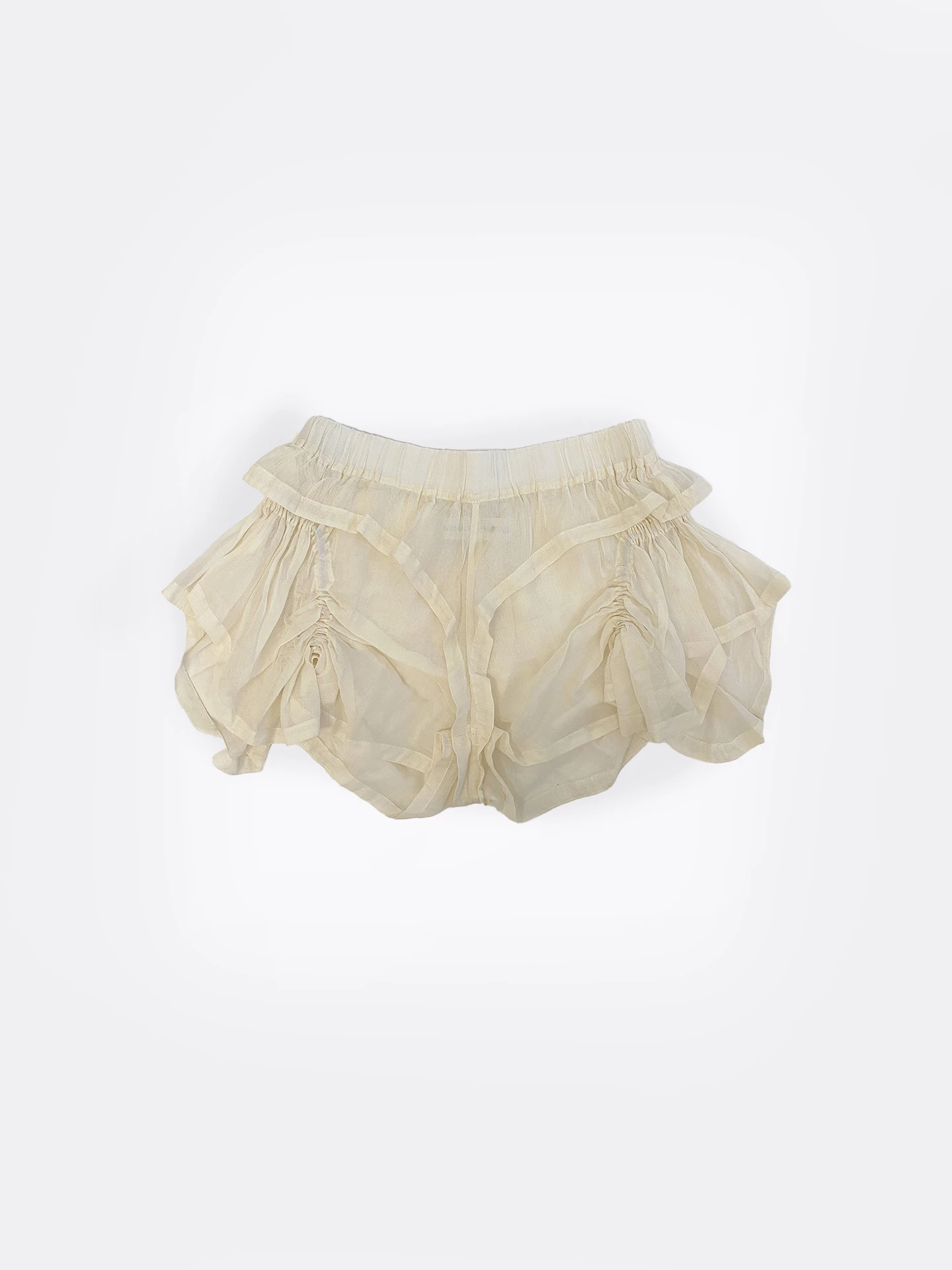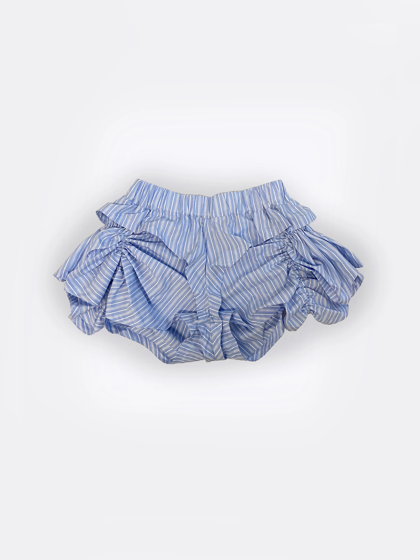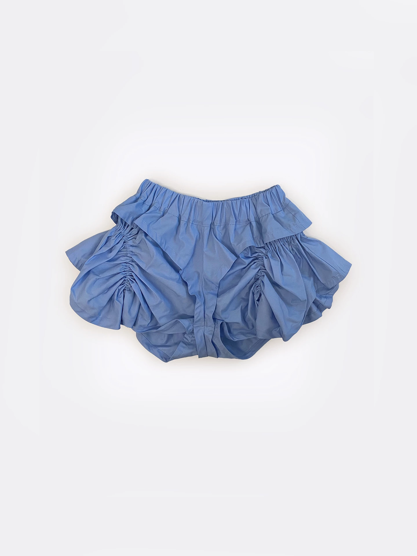 The ruffle shorts feature two layers of light cotton, gathered with elastic bands.